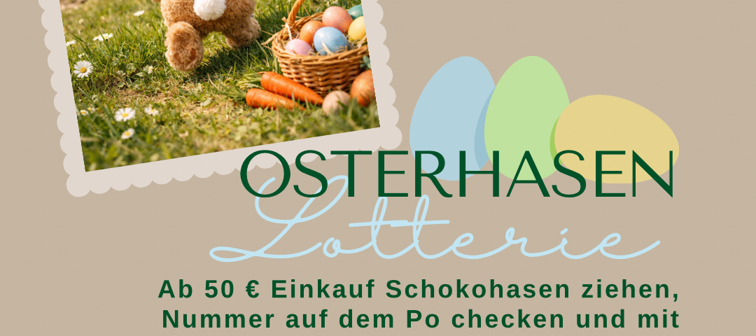 in der Zeit vom 16.3.-4.4.2026 haben wir eine Osterüberraschung für Sie parat. Ab einem Einkauf von 50€ dürfen Sie sich einen leckeren Schokohasen ziehen und mit etwas Glück nicht nur den Hasen sondern auch einen Tombolagewinn mit nach Hause nehmen.